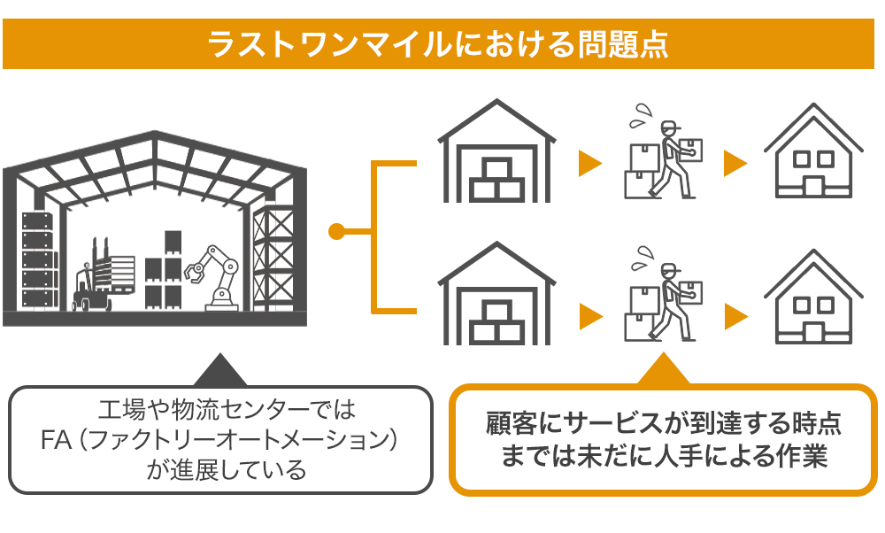 工場や物流センターでは、ロボットによる自動化(ファクトリーオートメーション)が進んでいるのに対して、お客様の手元に届ける最後の接点(物流のラストワンマイル)は依然として人手に依存しており、これを自動化することが課題となっています。