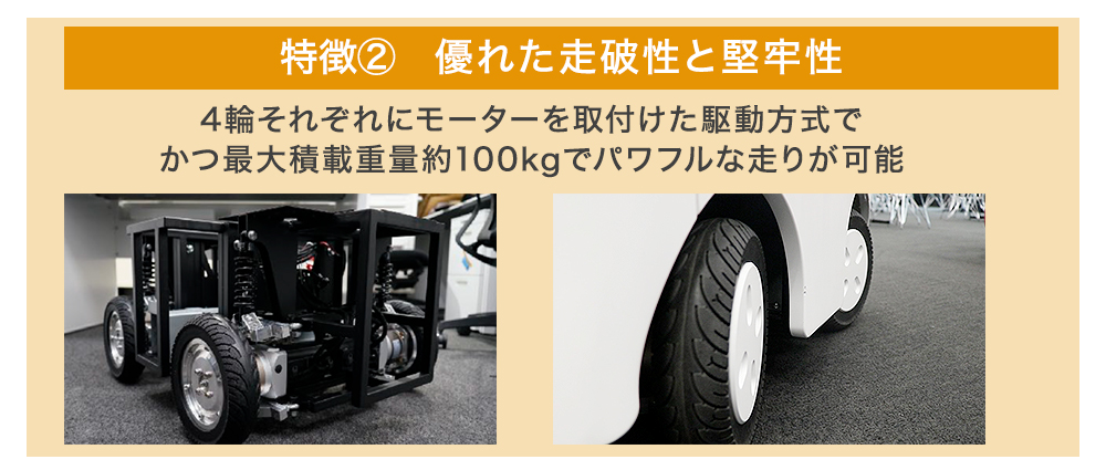 2つ目は「走破性と堅牢性に優れた設計」です。走行ユニットは4輪それぞれにモーターを取付けた駆動方式(4WD)で、かつ最大積載重量約100kgでパワフルな走りが可能です。さらに、全体を既製品で構成しており、メンテナンスしやすいのも特徴です。
