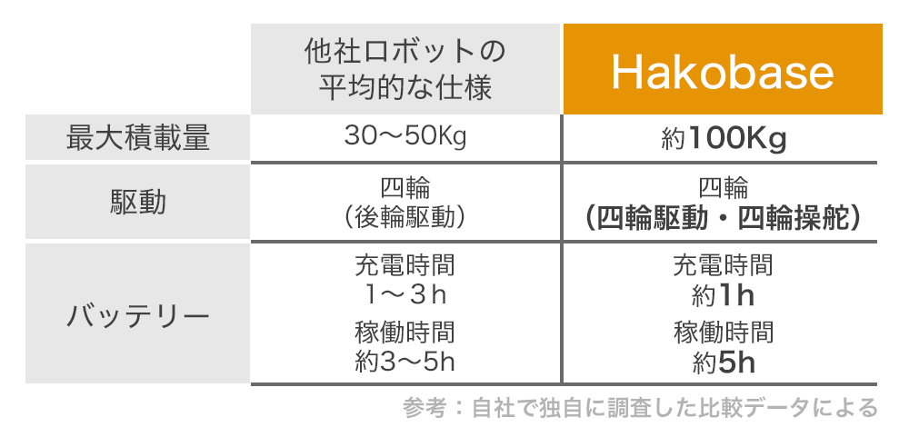 弊社は、「なんでも載せられる、しっかり運ぶ」をコンセプトに、シンプルかつタフ、そして走破性の高い自動走行ユニット「Hakobase」を開発しました。
