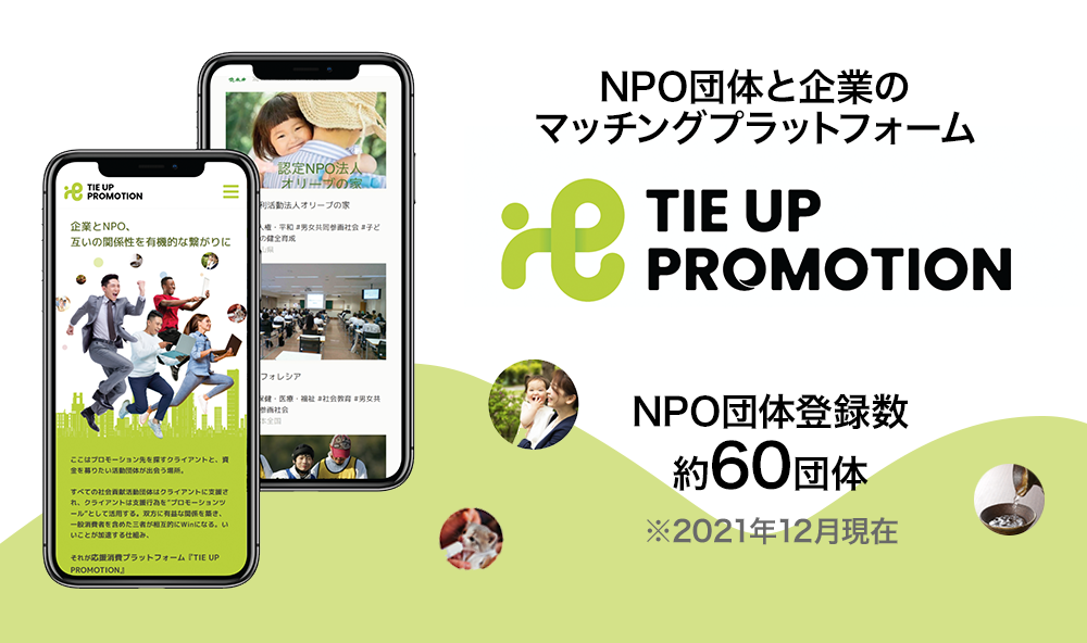 「TIE UP PROMOTION」には、既に様々なNPO団体が活動内容を掲載しており、2022年初頭から本格的なタイアップ(ビジネスマッチング)サービスの開始を予定しています。
