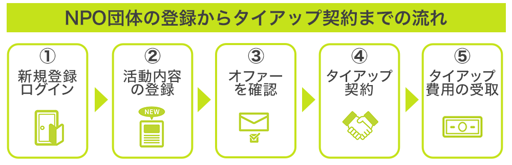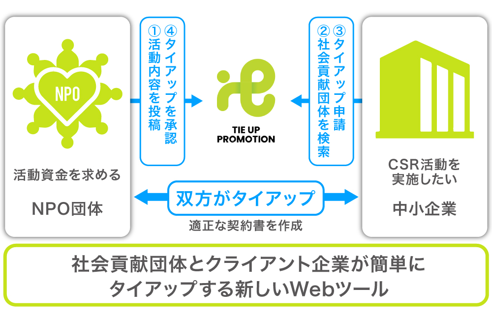 企業側は、地域や活動内容など自社のイメージに合った活動を行うNPO団体を検索でき、タイアップのオファーを依頼することが可能になります。その後、双方のプロモーション方法などを具体的に定めたタイアップ契約を締結し、タイアップ料の決済までを全てプラットフォーム上にてワンストップで実行を可能にする計画です。