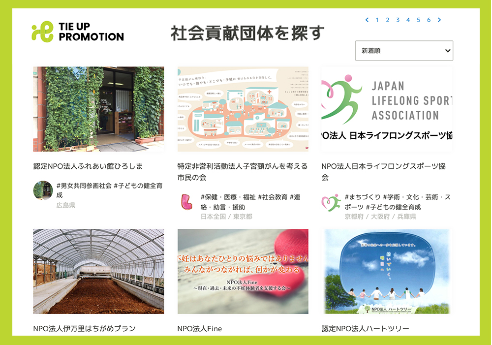 「TIE UP PROMOTION」には既に60以上のNPO団体の登録があります。登録されている団体の一覧ページを見れば、どのような団体が、どんな活動をしているのか、詳しく見ることができます。