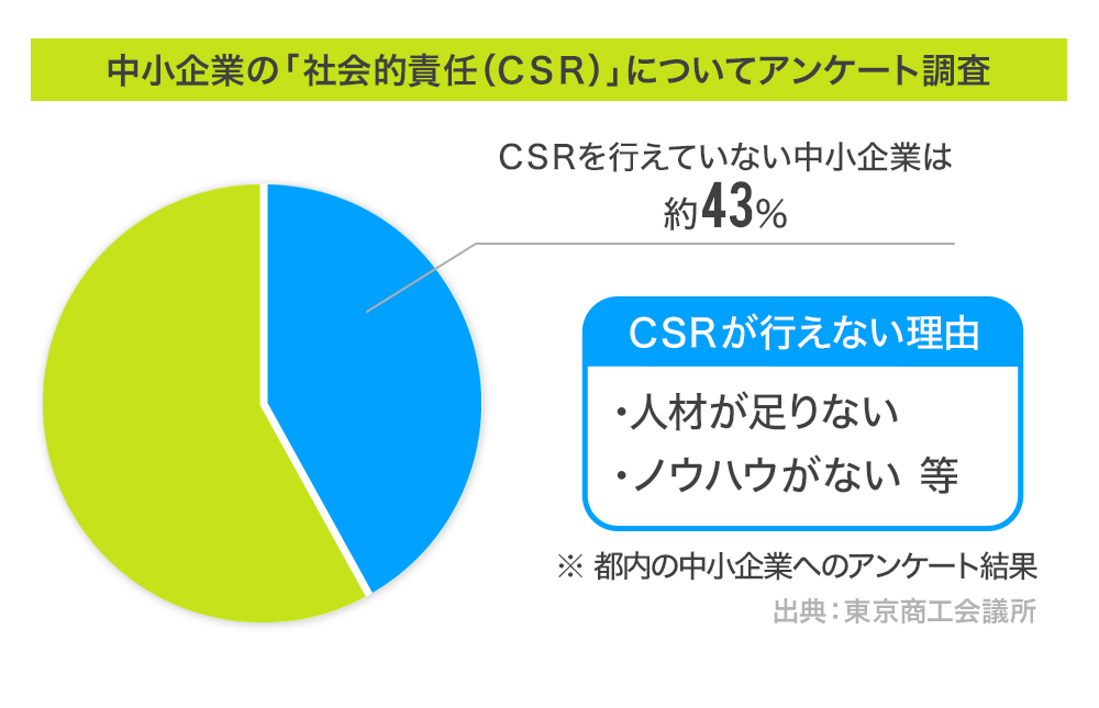現に、都内の中小企業を対象に行ったアンケートによると、自社で社会貢献活動を行えていない企業は40%を超えているという結果も出ています(出典:東京商工会議所)。