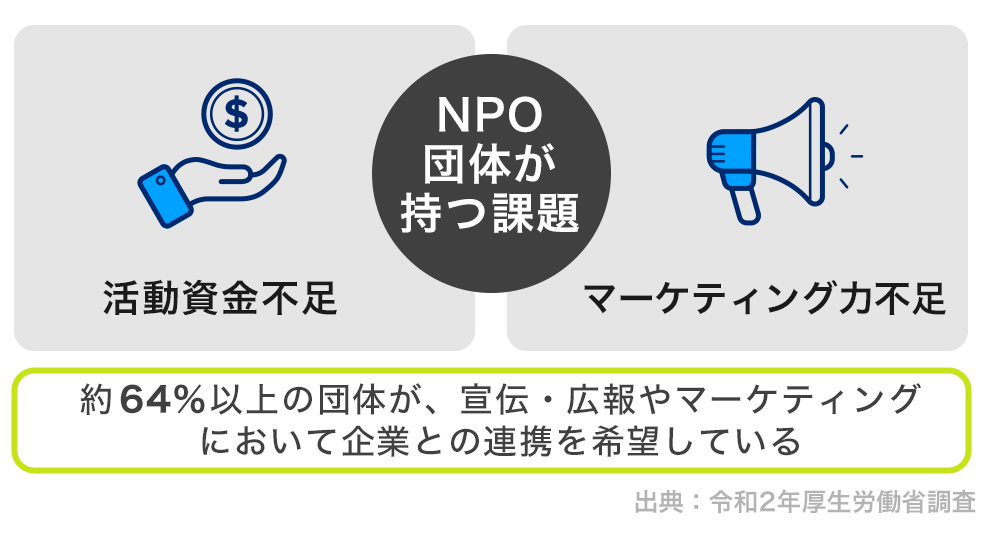 実際に、2020年の厚生労働省の調査では、64%以上の団体が、宣伝・広報やマーケティングにおいて企業との連携を希望するという結果も出ており、NPO団体と企業を繋ぎ合わせる高いニーズが存在します。