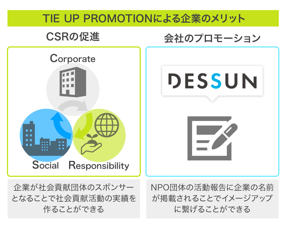 企業は、NPO団体への資金援助を、NPO団体は、社会貢献活動の中で企業プロモーションを行うことで、互いにメリットを生み出すことが可能になります。