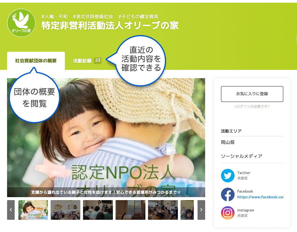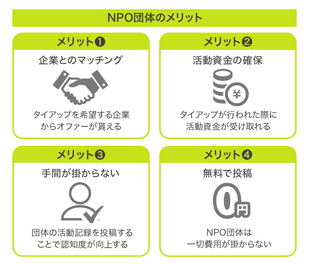 一方、社会貢献活動を行っているNPO団体にとっても、活動の幅が広がる機会を提供してくれるサービスとなっています。