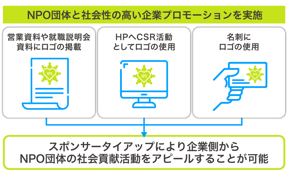 NPO団体とタイアップ契約を結んだ団体は、企業のホームページや名刺などにタイアップ団体のロゴを掲載してイメージアップ戦略を行ったり、NPO団体の活動冊子にスポンサー企業として紹介されるなど、多様なプロモーションが可能になります。