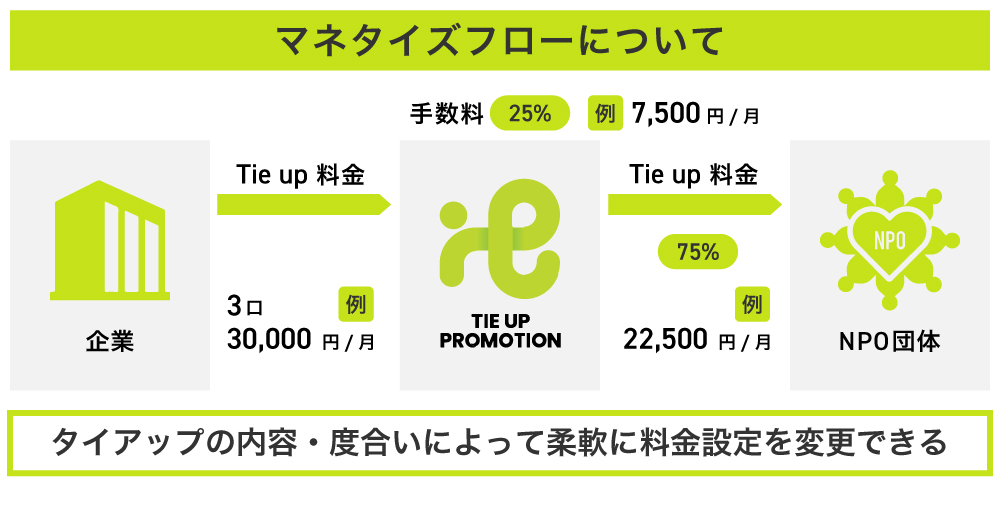 弊社は、企業がNPO団体への活動資金援助として支払うタイアップ料の一部を手数料収益とする計画です。タイアップ契約が締結された後も継続的なフォローを行うことで、一時的なタイアップではなく、継続性のある安定的な収益確保が可能なストック型ビジネスになると考えています。
