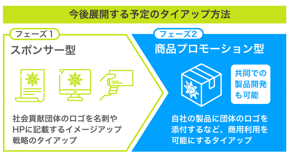 フェーズ1では、月額でタイアップ料をNPO団体に支払い、ロゴのなどの掲載を行うスポンサー型のPRを実装します。フェーズ2では、商品プロモーション型のタイアップも展開する計画です。