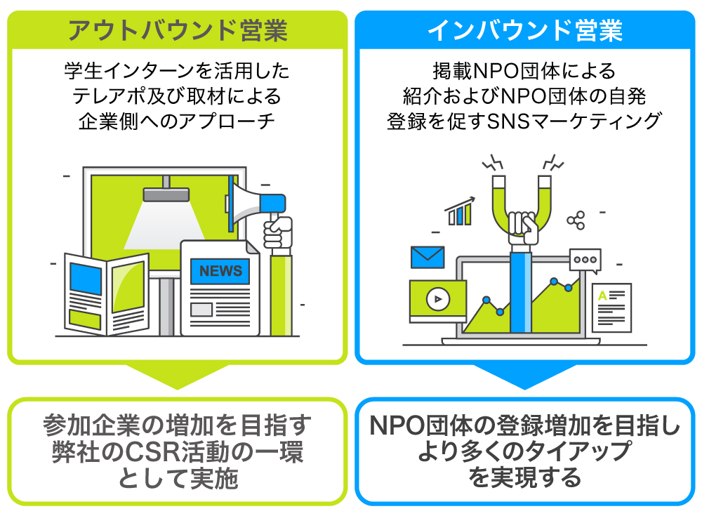 また、人材面での強化として、NPO団体へのアプローチを促進するため、学生インターンによるテレアポ及び取材によるアウトバウンド営業と、掲載NPO団体による紹介およびNPO団体の自発登録を促すSNSマーケティングによるインバウンド営業を行う計画です。