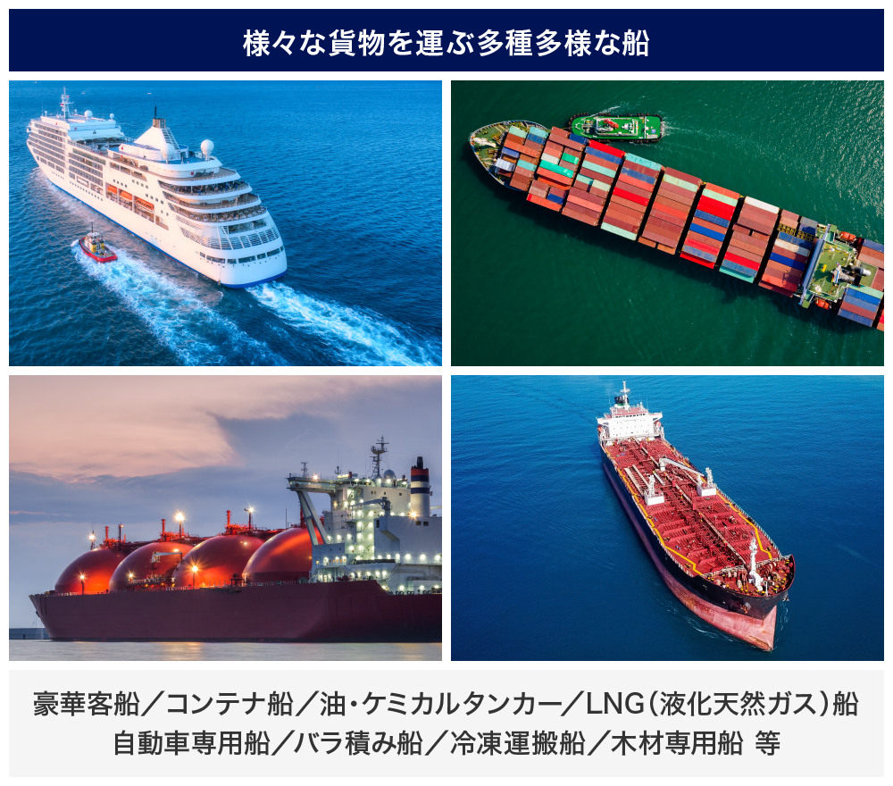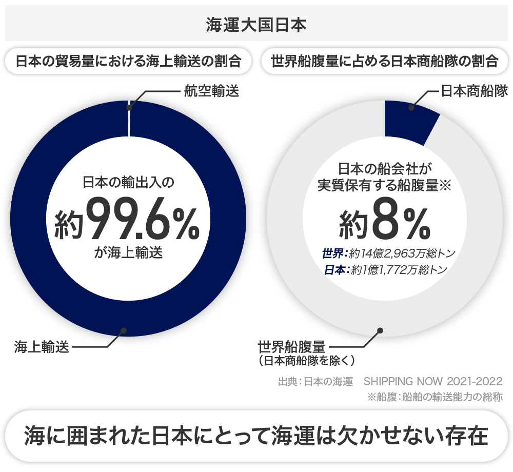 海運業は日本の貿易の約99.6%を占めており、身の回りの日用品や食料の輸送、ガソリン価格の変動に影響を及ぼすなど私たちの生活に深く関わっています。