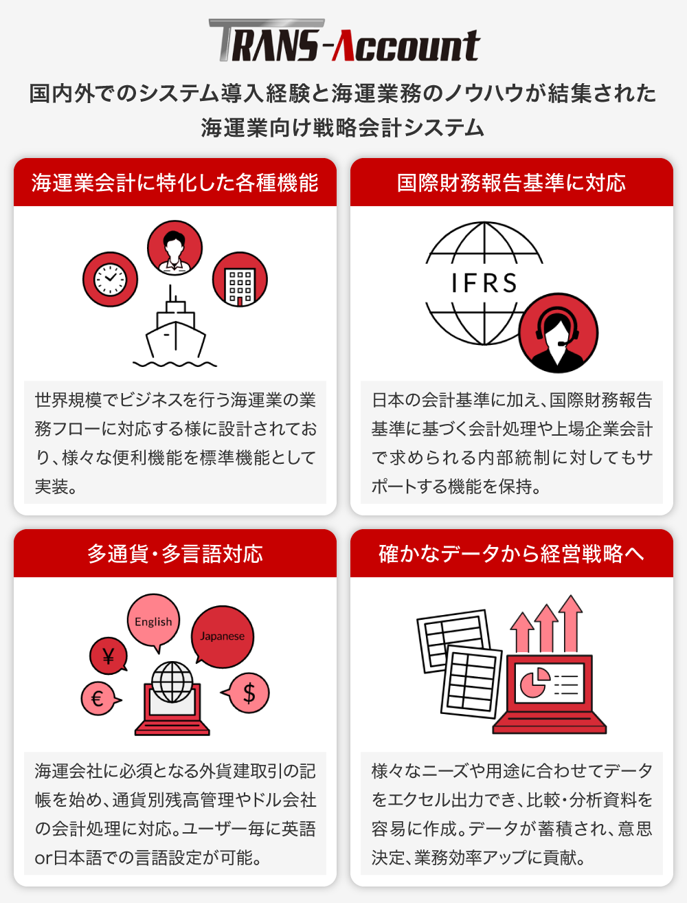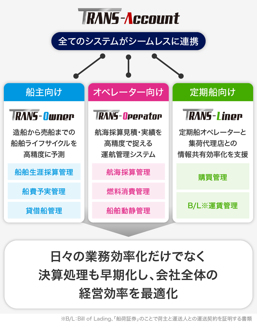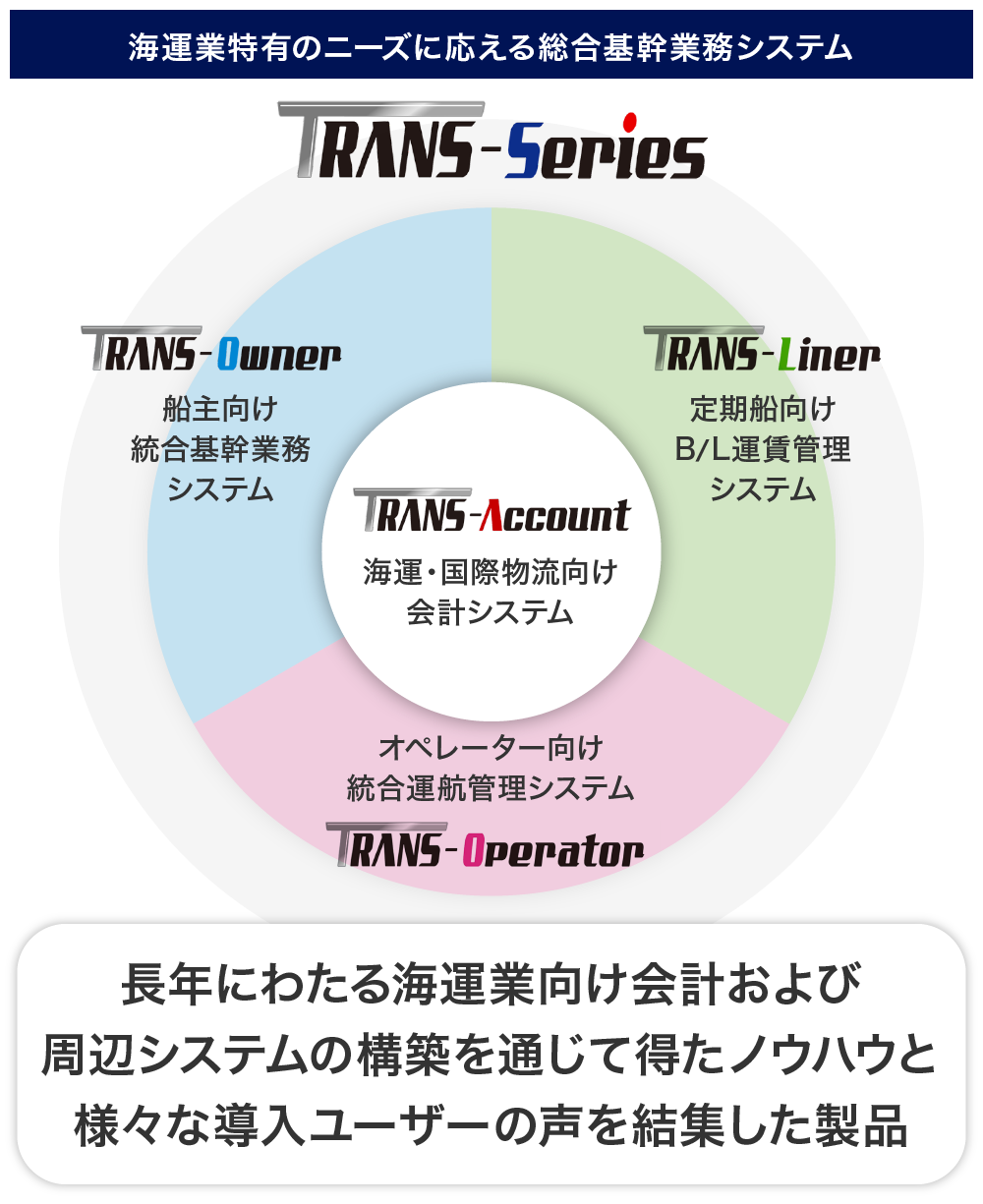 「TRANS-Series」は、海運業特有の会計処理に対応した「TRANS-Account」をはじめ、運航管理や船主向け決算予測など海運業における様々な業務をサポートする製品をセットにしたものです。