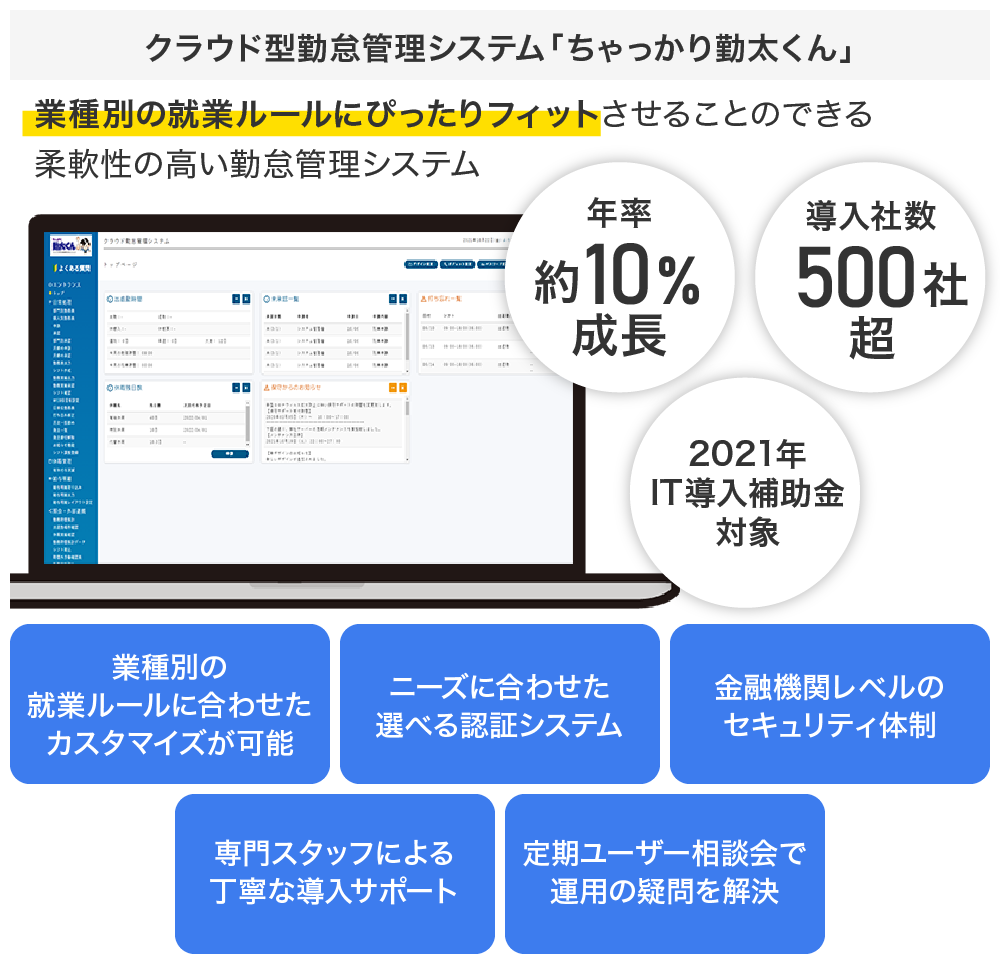 また、こうした複雑化した海運業務ニーズに対応してきたシステム開発ノウハウを生かしてクラウド型の勤怠管理システム「ちゃっかり勤太くん」も手掛けています。