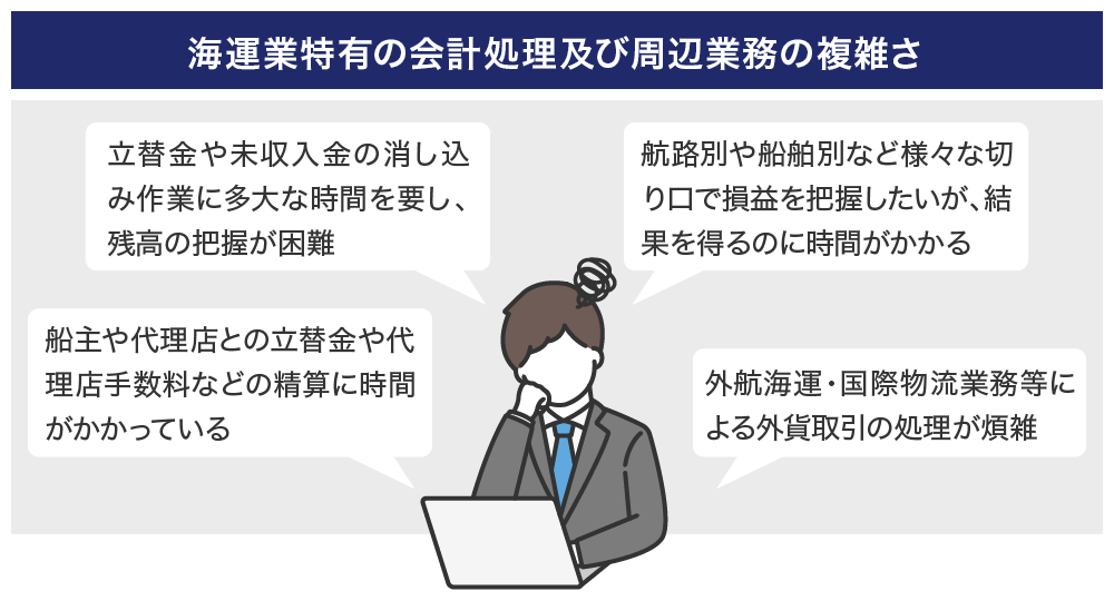 しかし、海運業には無数に発生する仮勘定から本勘定への振替作業や外貨対応など、業界特有の複雑化した会計処理が求められます。加えて、人の経験や勘に基づいたコスト算出や不透明なコストが生じるなど一航海あたりの損益把握は容易ではありません。