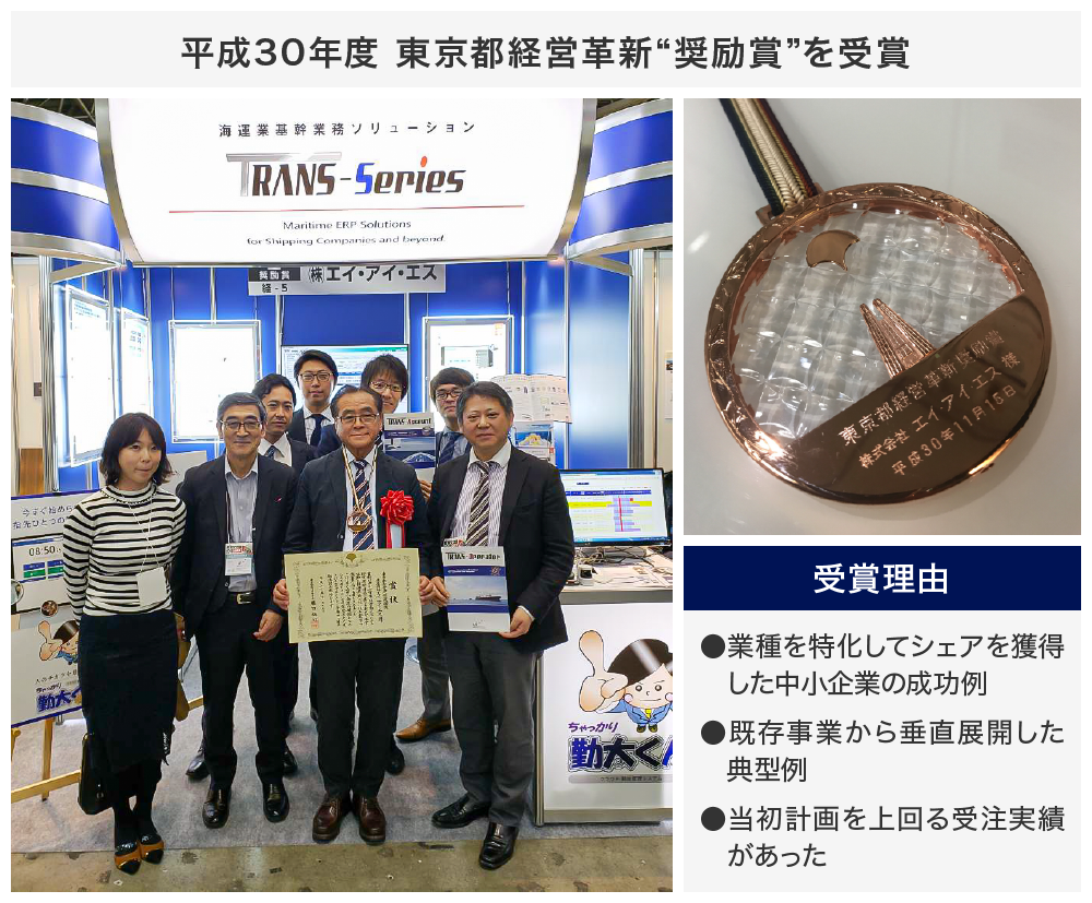 現在までに、大手海運会社や商社を含む約50社に導入されており、日本船主協会加盟会社のシェア約30%にまで拡げることができました。さらに、会計システムから海運業の総合システムへと拡大したことが評価され、2018年に東京都経営革新奨励賞を受賞しています。