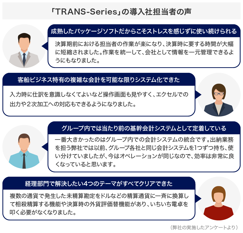 弊社は開発だけでなく、販売から保守まで自社で担うことで徹底してユーザーに寄り添ってきました。そのため、「TRANS-Series」は、長年にわたる海運業向け会計システムおよび周辺システムの構築を通じて得られたノウハウと導入ユーザーからの声を結集した製品となっています。