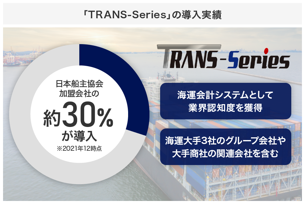 そうした中で、弊社は海運業特有のニーズに応える総合基幹業務システム「TRANS-Series」を開発しており、一般社団法人日本船主協会加盟会社の約30%のシェアを獲得するなど既に国内外の多くの海運会社にご利用いただいています。