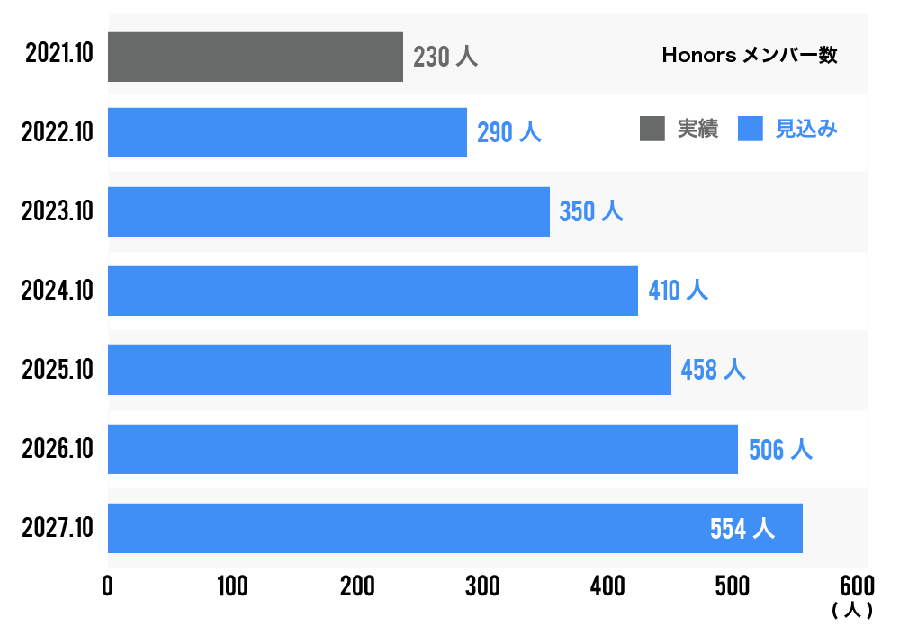こうした機能を年会費10万円で提供しており、関東・関西を中心に北海道から九州まで会員数は約250名となっています。まずは会員数を500名程まで増やし、クオリティを維持しながら全国どこにでもHonorsメンバーが活躍する体制を作っていきます。