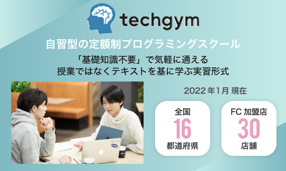 弊社は、自習型の定額制プログラミングスクール「テックジム」をFC(フランチャイズ)展開しているベンチャー企業です。