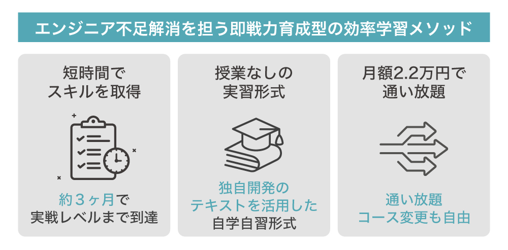 そこで、この取り残されたニーズを埋めるために設計されたのが弊社の「テックジム」です。同スクールでは、現役社会人などを対象に、短期間でも自走できるエンジニアが育つよう、生徒自身で演習を実行させる自習形式のスクールを、何度でも通える定額制で展開しています。自習形式なので安価で学ぶことができるのもポイントです。