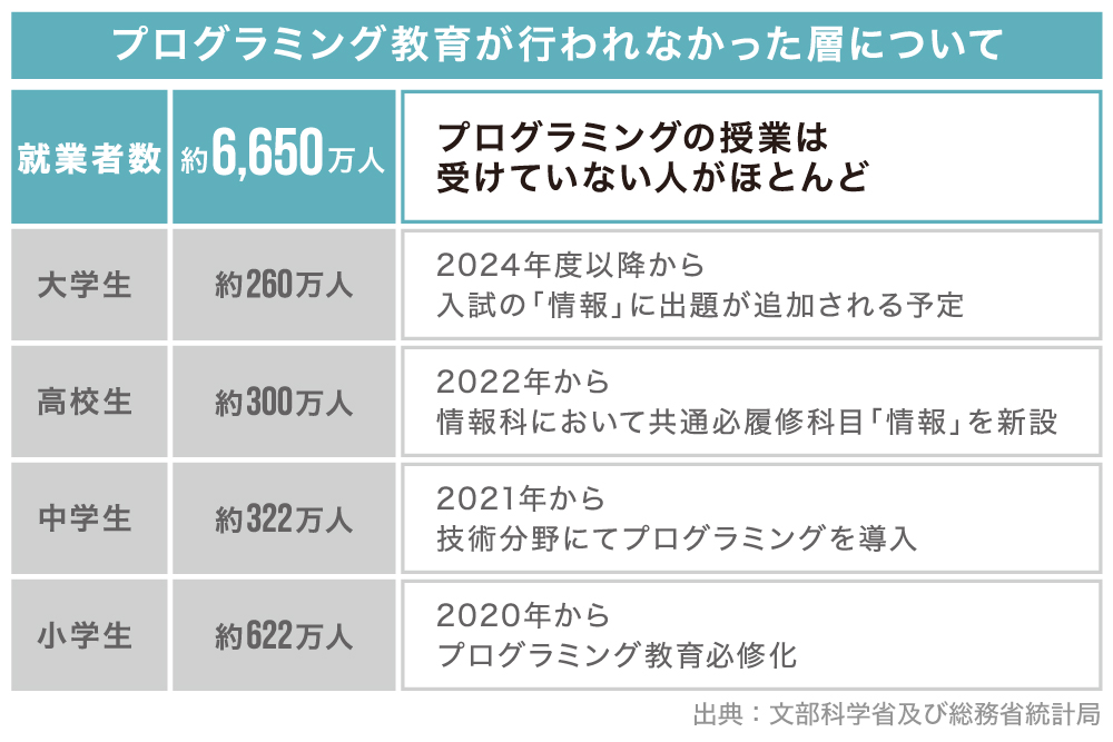 一方で、現行の学校教育で育てられる高校生や、日々の業務ですでにプログラミングの必要性に直面していながら、そのスキルを持たない20〜40代の社会人は取り残されることになります。以前のプログラミングスキルがあれば”得する時代”から、今後は”使えないと損する時代”になりつつあり、彼らのような非IT人材こそプログラミングを学ぶニーズがあると考えています。
