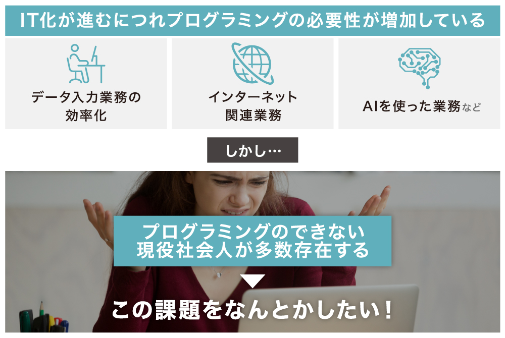 しかし、現代の社会人にとって、プログラミング教育はあまり身近なものではないと思います。知識のない状態からの独学では勉強方法を理解するのも大変です。また、既存のプログラミングスクールに目を向けると、子供や学生向けの義務教育を補う形式のものや、一定数スキルのある人への転職向けのものが大半で、プログラミングに不慣れな非IT人材が「1から学べるタイプ」のスクールは少なく、また、あったとしても高額なものになると思います。