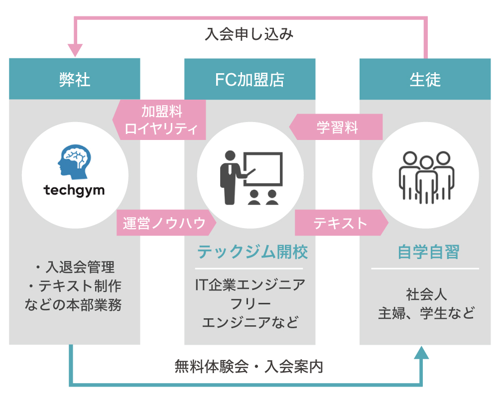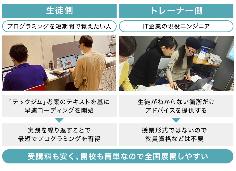 また、FC展開するトレーナーは専任の教師などではなく、一定の経験があるプログラマーの方に務めていただきます。