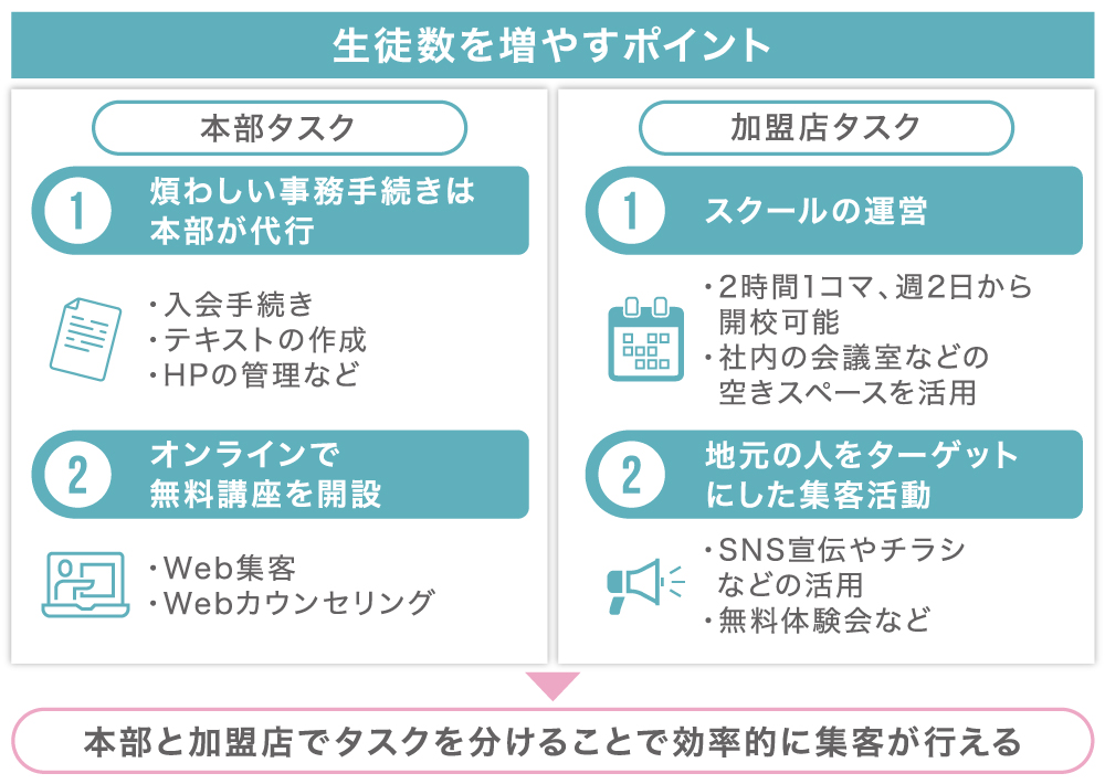 そのためにも、本部では運営ノウハウを提供するだけでなく、教材の開発や、生徒の入退会管理や、入会費・月会費などの集金管理業務、オンライン説明会まで対応しています。