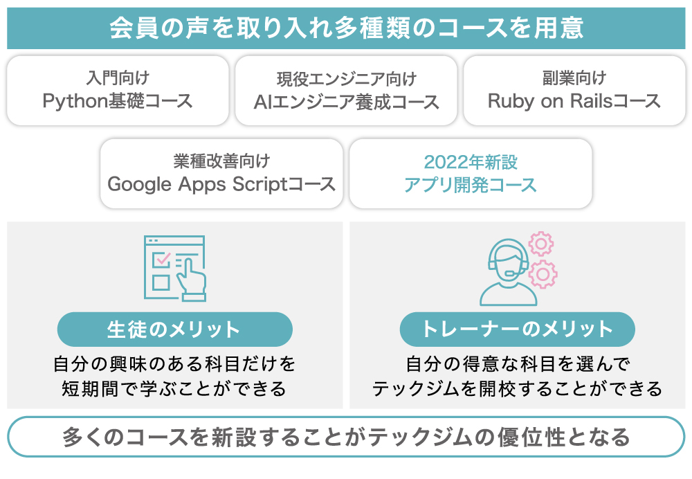 テックジムのカリキュラムは年々拡大をしていますので、これらの学びの選択肢を増やすことで更に多くの学びを多くの方に提供できるように進めて行くことを期待します。