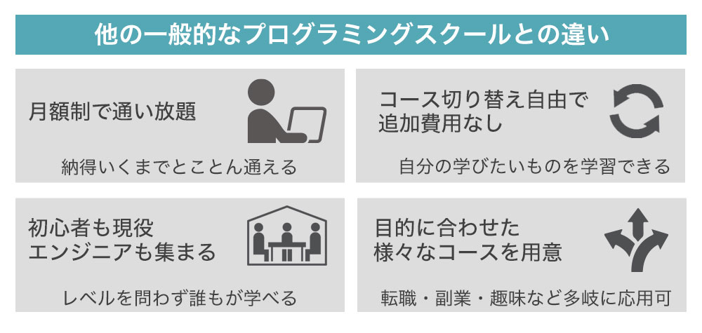 世の中の多くのプログラミング塾は、3ヶ月で30万円以上のものも多く、しかも転職に成功するのは1割程度と聞いていました。