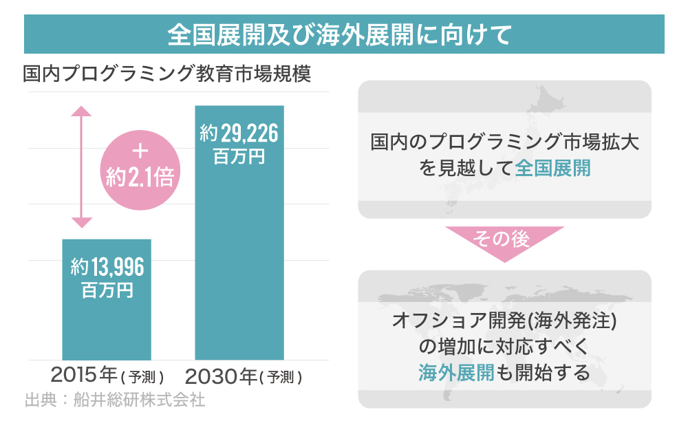 プログラミング教育の市場は、この先5年で2倍以上に成長すると予測されています(出典:船井総合研究所)。この需要の増加に合わせて、今後も、各地でのイベント及びFC向けセミナーを積極的に開催し、FC加盟を加速化させていきます。