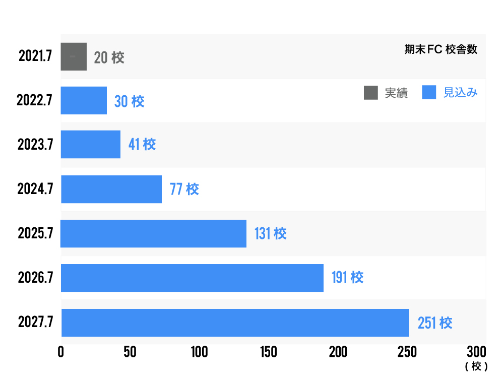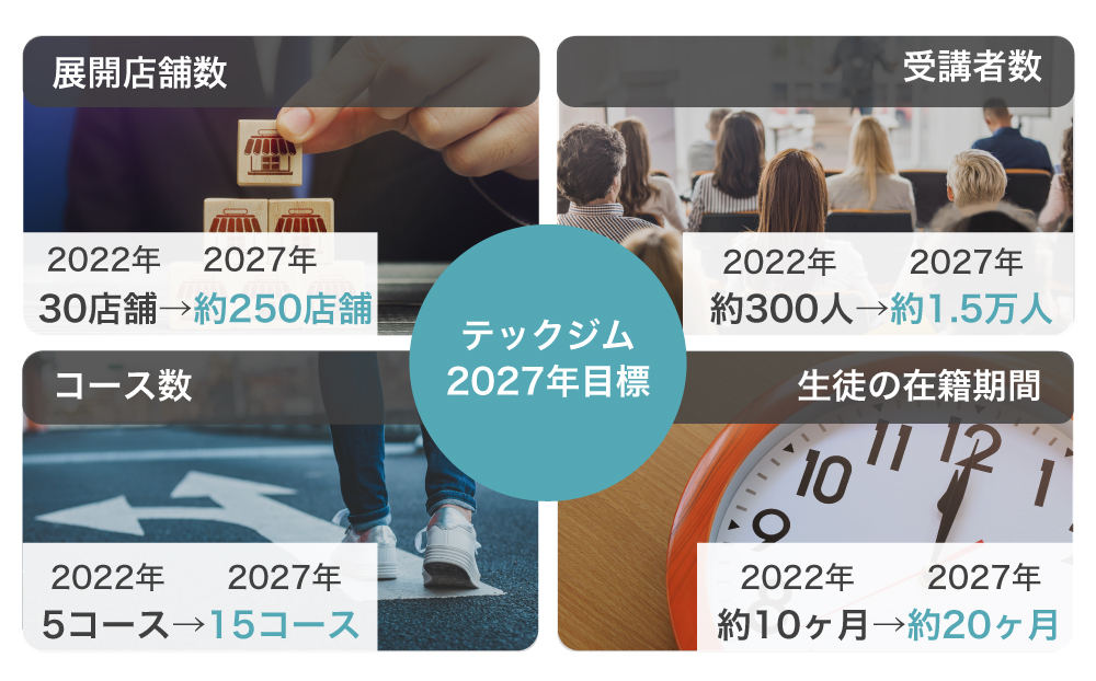 現在は、生徒の在籍期間が平均10カ月ほどですが、今後は、さらにコースやカリキュラムを拡充し、同時に、業務改善も図ることでユーザービリティを高め、平均在籍期間を20カ月程度まで伸ばしていく計画です。また、2027年までにはFCを約250店舗まで増やしたいと考えています。