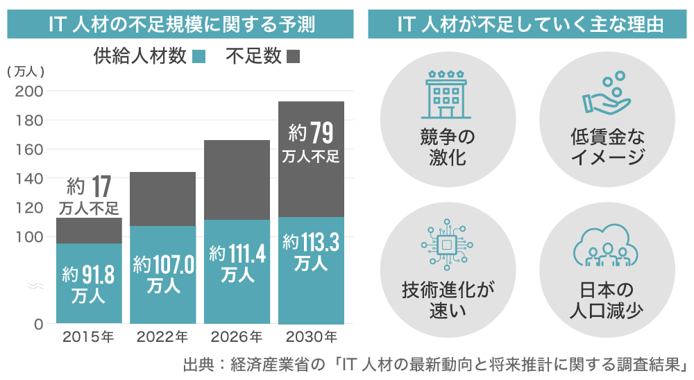経済産業省の発表によると、日本のIT人材の不足は年々深刻化しており、2015年ですでに約17万人も不足していたのが、2030年には約79万人にまで悪化すると予測されています。