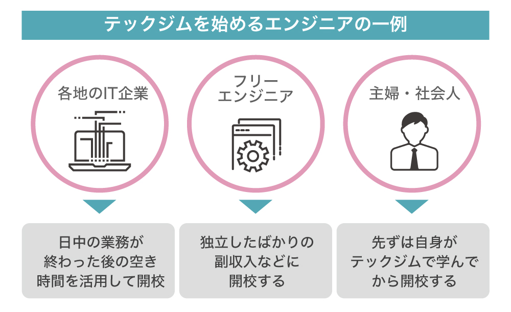 地元のIT企業のまとめ役になりたい企業や、フリーエンジニア、または副業など様々な方にテックジムを開校していただくことが可能です。