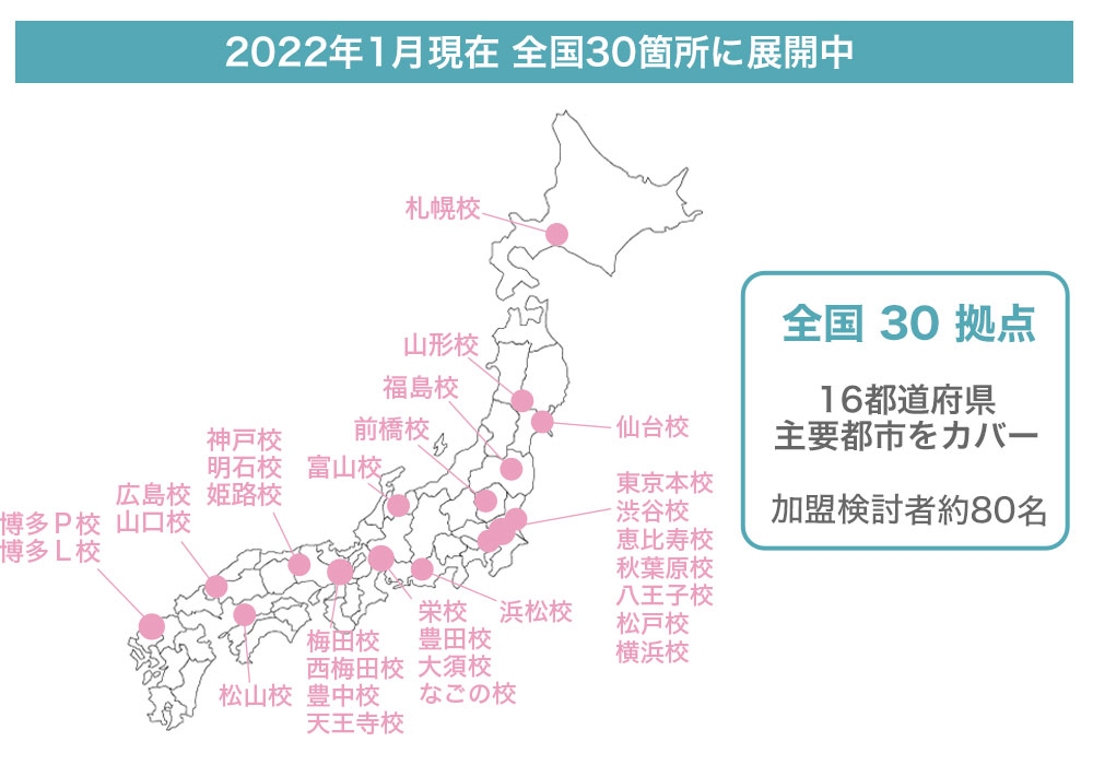 2022年1月時点においてFC加盟店として全国16都道府県に30店舗展開しており、現在も開校待ちの店舗が多数あります。さらに、FCに前向きな検討者も80名ほど抱えており、順調に加盟店を増やしています。
