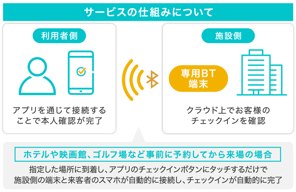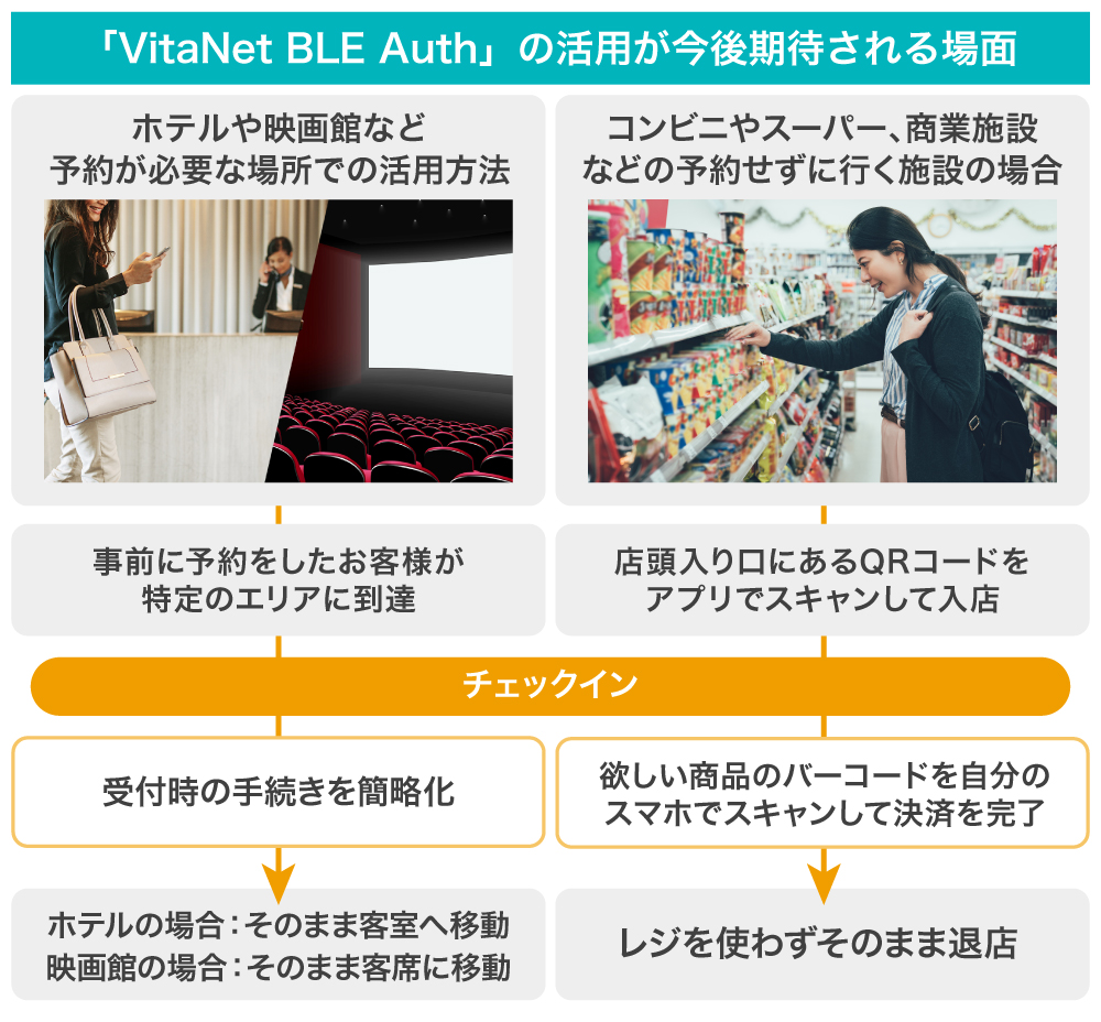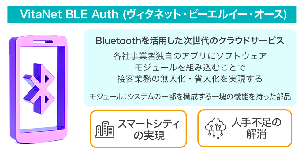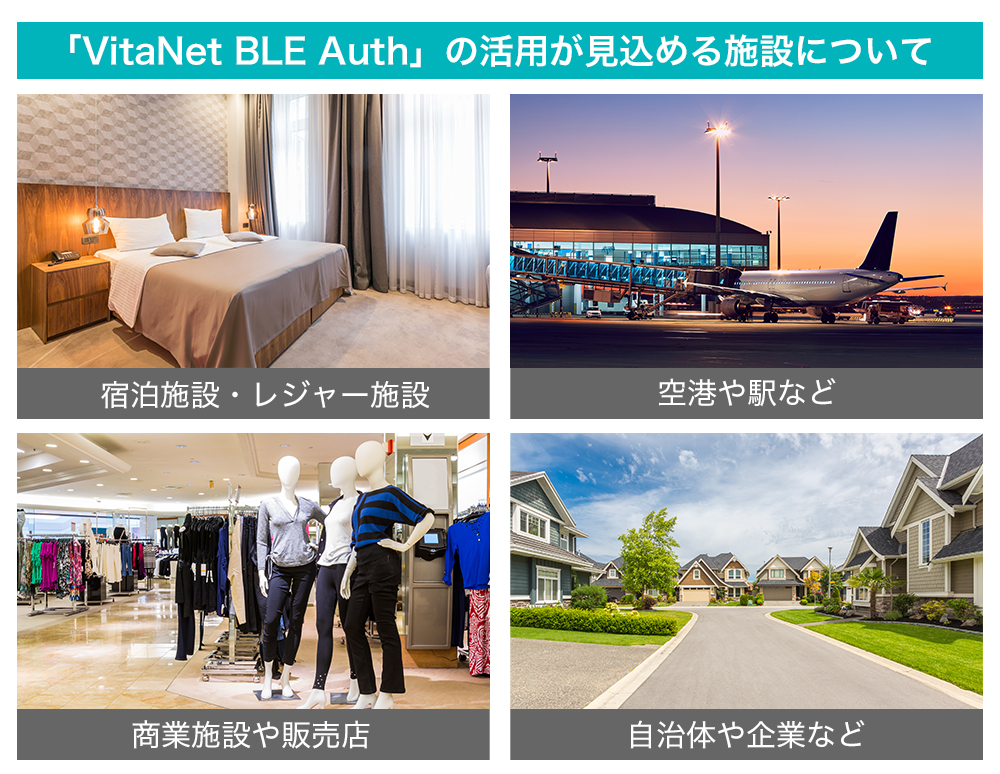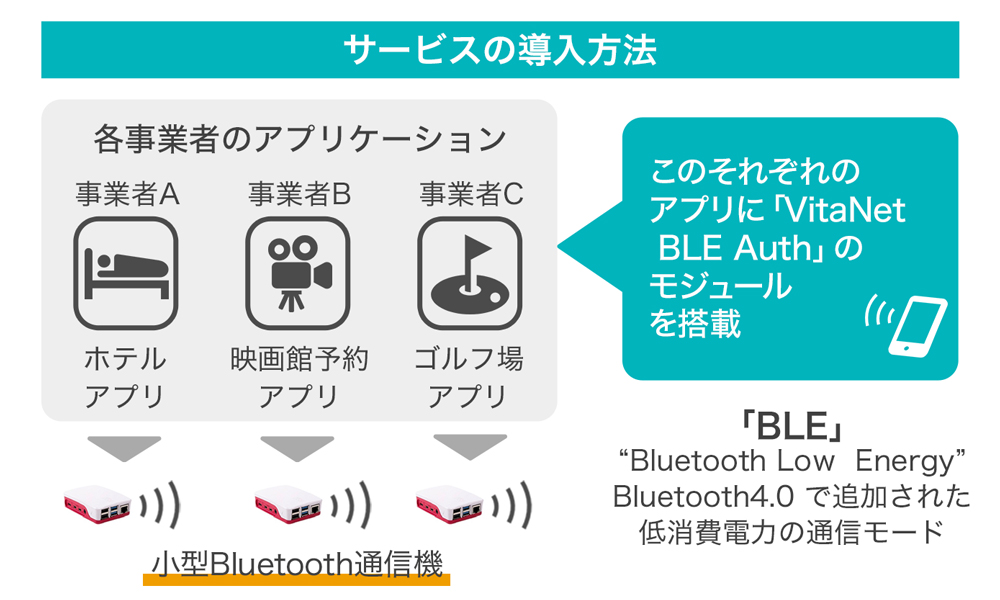 「VitaNet BLE Auth」は、ホテルや店舗などの運営事業者が提供するサービスアプリに「VitaNet BLE Auth」のシステムを組み込み、「VitaNet BLE Auth」専用のBluetooth通信端末を同施設に設置するだけで利用可能になります。