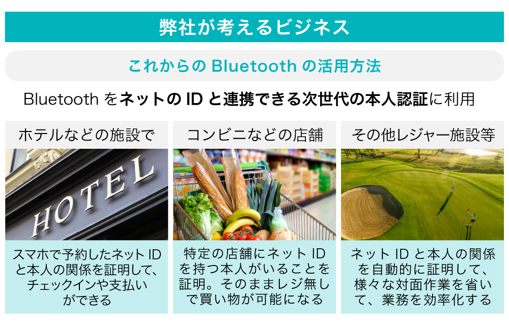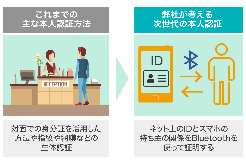 弊社は、このBluetoothの利用範囲を大きく広げて、ネット上の本人IDと、実在する本人を結びつけることで、新しい形で本人認証を可能にします。
