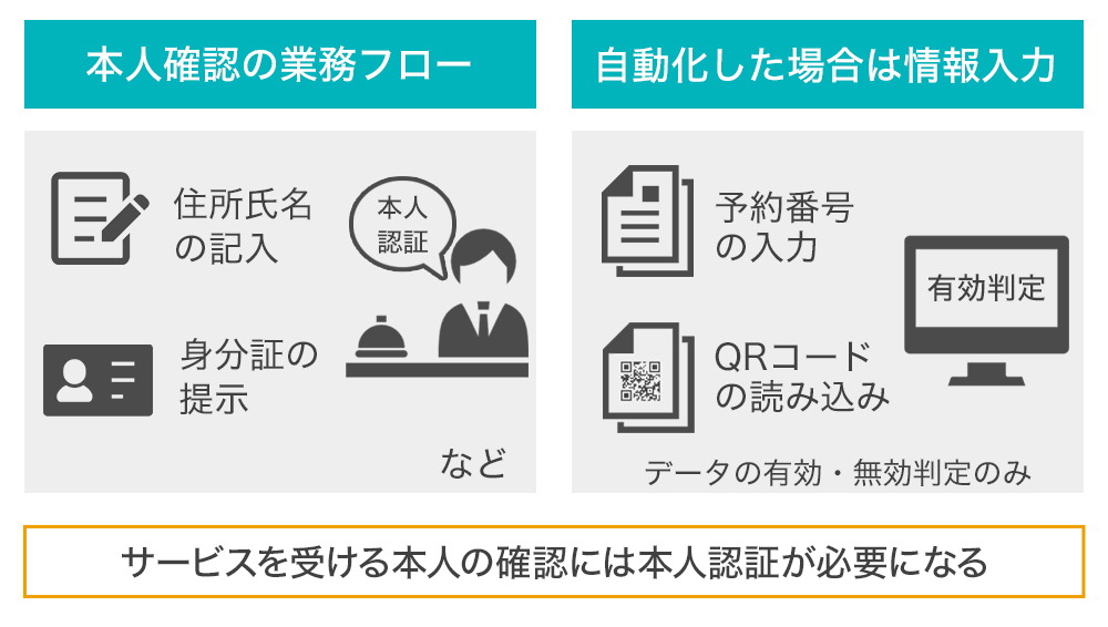 その原因は「本人確認の業務」にあると考えています。例えばホテルやゴルフ場などの受付の場合、法令の定めにより、対面での受付、または自動受付機などで、予約した本人かどうかを確認するための本人確認をしています。