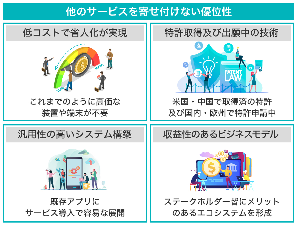 弊社のビジネスモデルは、店舗や施設のコスト削減や売上の拡大だけではなく、システム開発会社の拡販にも貢献できると考えます。スマホを使う消費者も、簡単な操作と、より良いサービスを受けることができるようになります。
