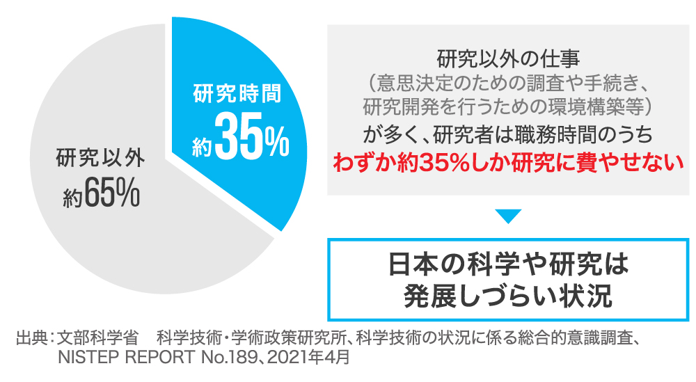 æ¥æ¬ã®å€§åŠã§ã¯ãç ç©¶ããããã®æç¶ããç ©éã§ãç 究以å€ã®ä»äºããå€ããç ç©¶æéãè·åæéã®ããã35%ãããªãããšããããŒã¿ããããŸãïŒåºå žïŒæéšç§åŠçïŒã