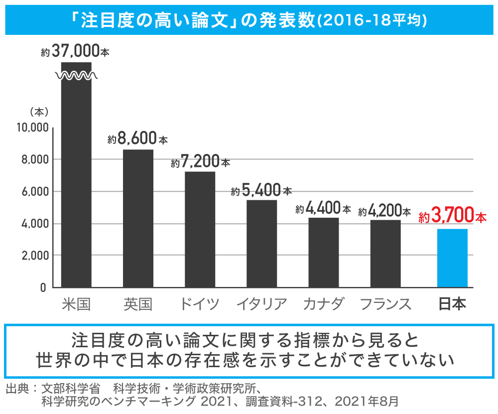 ããã¯æè¿ã®ããŒã¿ãèŠãŠãæããã§ããååœã®ç ç©¶ææã¬ãã«ã倿ãã1ã€ã®ç®å®ãšããããæ³šç®åºŠã®é«ãè«æãã®çºè¡šæ°ãèŠããšãæ¥æ¬ãè¿å¹Žçºè¡šããè«æçºè¡šæ°ã¯å é²7ã«åœã®äžã§ãæäžäœãšãªã£ãŠããŸãïŒåºå žïŒæéšç§åŠçïŒã