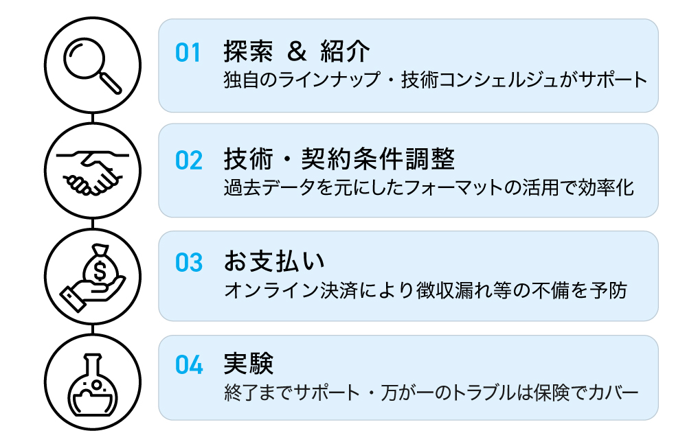 さらに、技術コンシェルジュが契約の交渉から研究開発の実施に至るまでサポートするので、ノウハウが不足していても安心です。