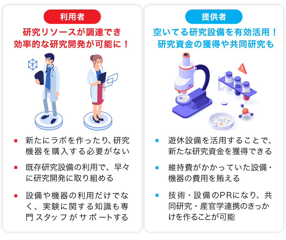 弊社は、設備や技術が不足しているために研究開発を推進できていない研究者や法人(以下、利用者)と、設備・技術はあるのに資金やデータ(サンプル)をもたないラボ(以下、提供者)とをマッチングし、取引サポートすることで前述した課題の解決に挑みます。