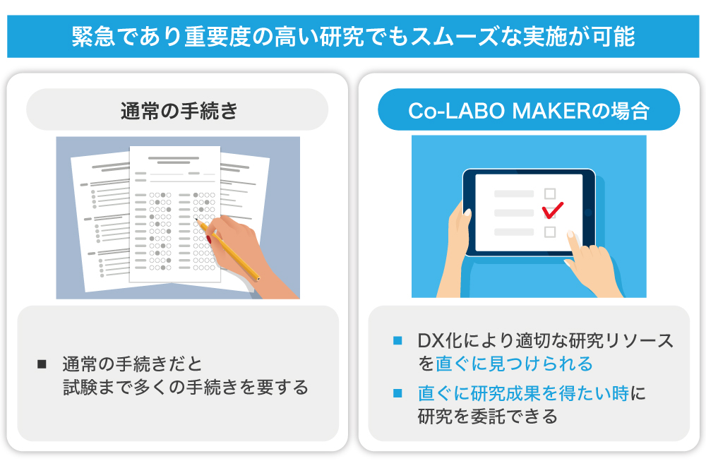 ãããŸã§ãã©ããåããå Žåã«å€ãã®æéãšäºç®ãããã£ãŠãããã®ãããCo-LABO MAKERããæŽ»çšããããšã§ãå šåœã®ã©ããæ€çŽ¢ãããå®éšãå§èšãããããããšãå¯èœãšãªããç ç©¶ãå€§å¹ ã«å¹çåã§ããŸãã