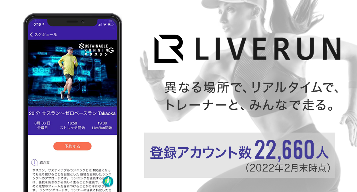 弊社は、ランニングをはじめとする様々な運動体験を、リアルタイムに不特定多数の人々と共有するアプリ「LIVERUN(ライブラン)」を開発・運営しています。