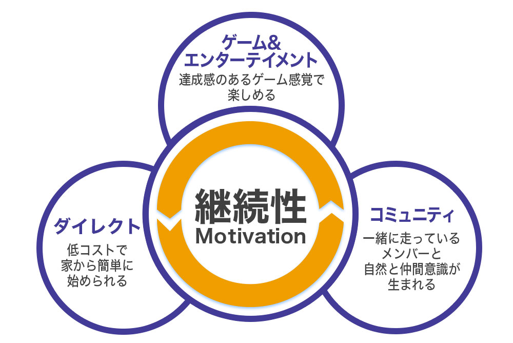 弊社は、人が何かを継続する際に重要視される要素は「ゲーム性」と「コミュニティ性」であると考えています。ゲーム性とは何かに勝利する、目標を達成する、報酬を手にするなどの満足感を味わうことができる性質のことです。
