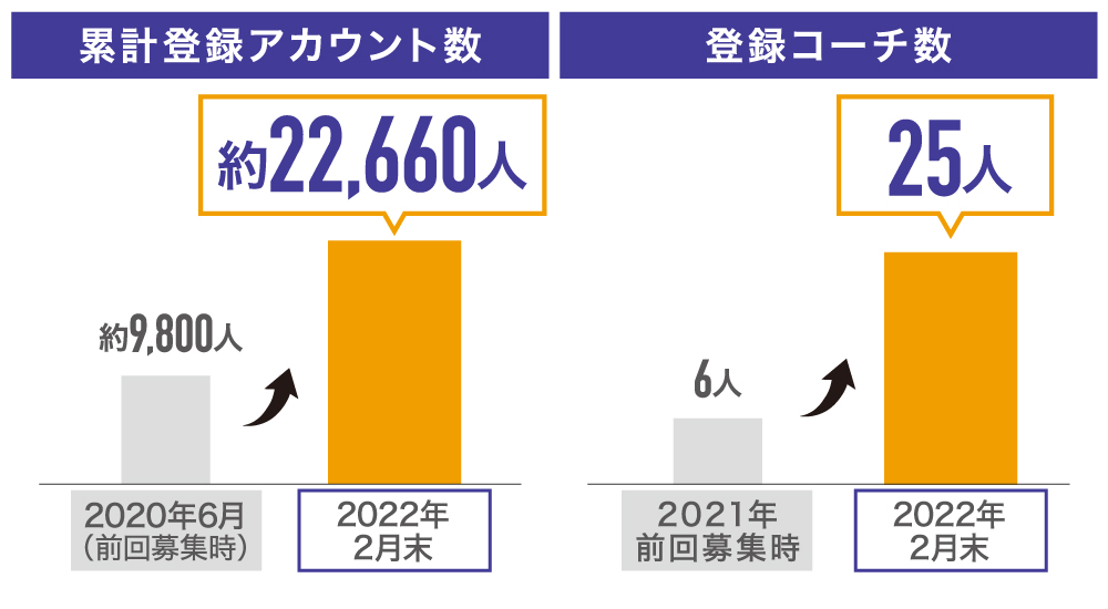 その一つが、コーチ(MC:実況者)のグレードアップです、弊社では様々なコーチを招き、多種多様なコンテンツを配信するためコーチの採用を強化し、2022年2月末時点では25名となっています。