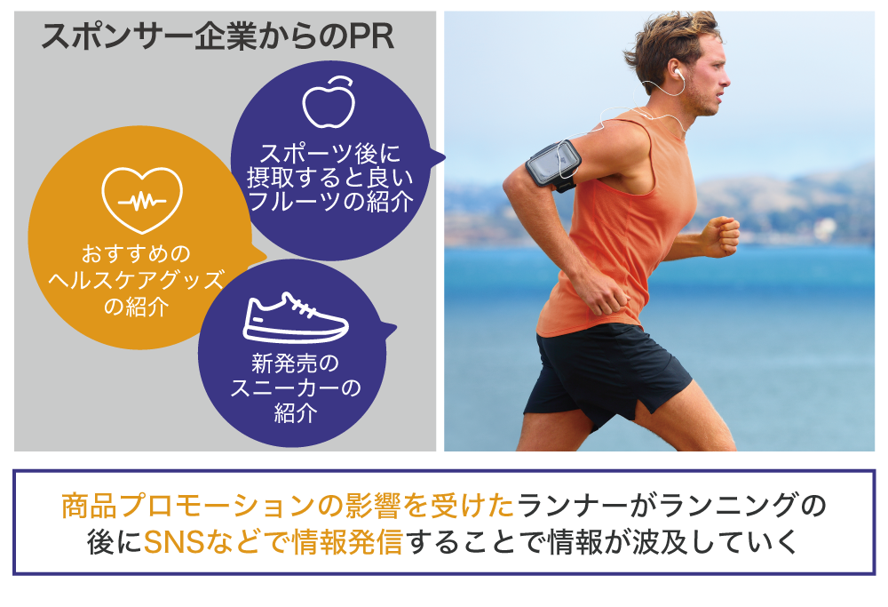 例えば、1回40分のランの中で、MCからスポンサーの商品またはサービスのPRを自然に混ぜて行います。最近では、数秒でスキップされる広告が大半な中、ランニング中ずっとMCを聴いているランナーに効果的にPRできるということもあり、この影響は企業にとっても好評をいただいています。
