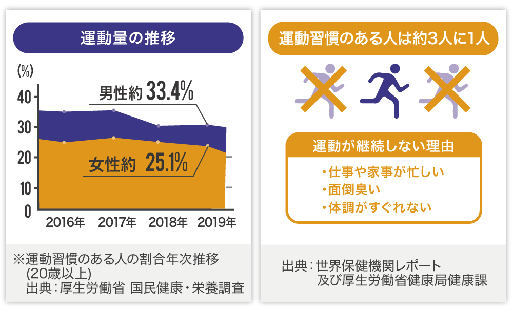 弊社は、日本人の運動量の少なさに課題を感じています。厚生労働省の国民健康・栄養調査によると、2019年で日本人の成人のうち、約29%の人しか健康を維持するのに必要な運動・身体活動ができていないと言われています。