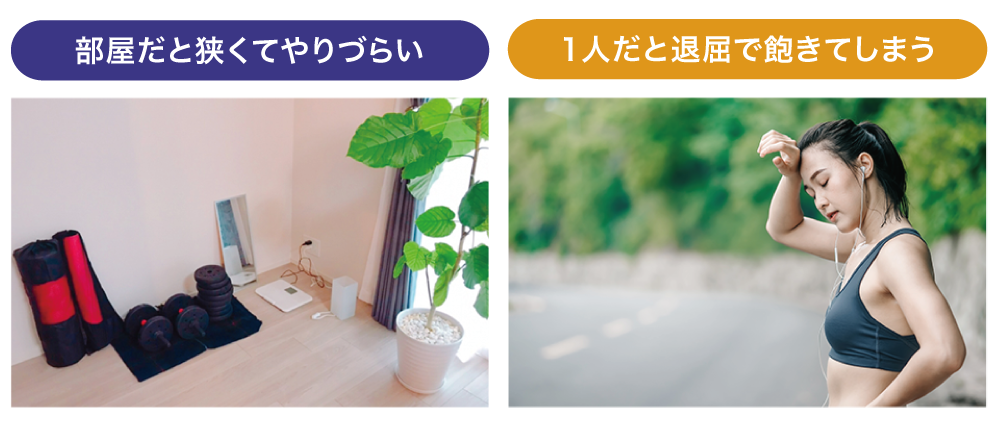 一方で、ジムに通わず自宅や公園で筋トレやランニングする方法もありますが、自宅では狭くて場所がなかったり、外でランニングしていてもしばらくすると飽きてしまったりと、継続させるのが難しいと考えます。
